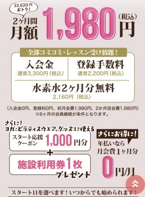 今だけ超お得に始められるチャンス!2ヶ月間月額 1,980円(税込)さらに入会金 0円登録手数料 0円水素水2ヶ月無料特典も充実1,000円分ク...read more