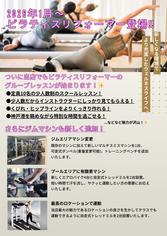 今、国内でも人気が急上昇しているリフォーマーピラティスが、メリケン店でも本格的に体験できるようになります。