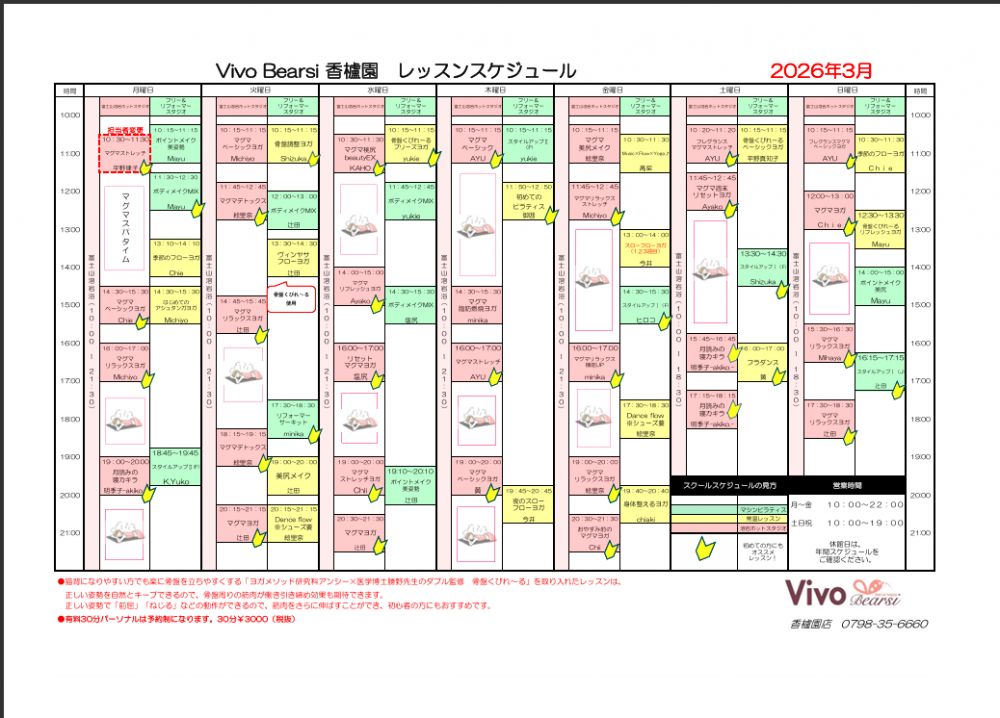 3月レッスンスケジュール・祝日スケジュール