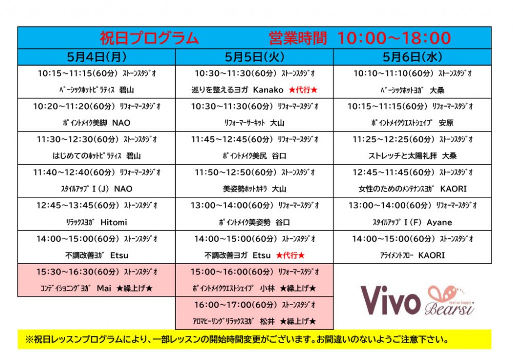 5月ゴールデンウィークのレッスンスケジュールのお知らせ