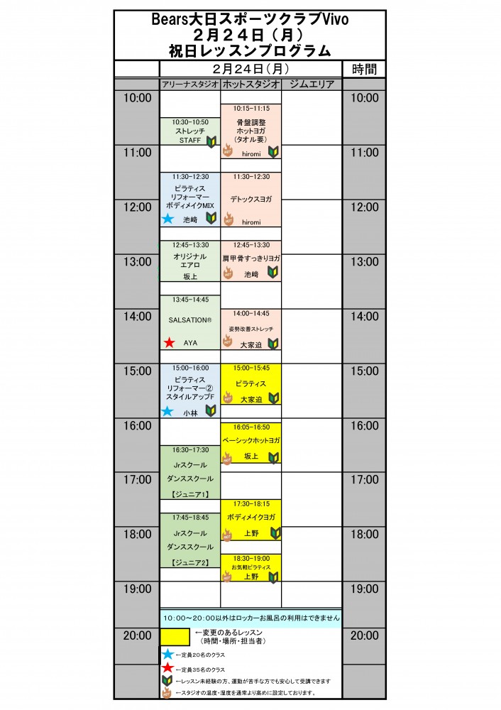 2月24日(月)祝日レッスンスケジュール