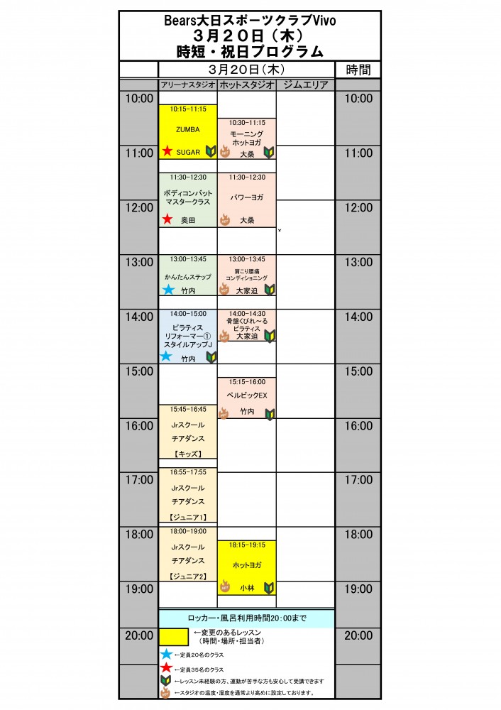 3月20日(木)祝日レッスンスケジュール