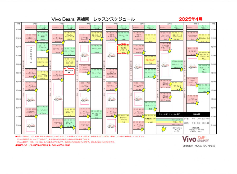 香櫨園店4月レッスンスケジュール 祝日スケジュール ※訂正版です!