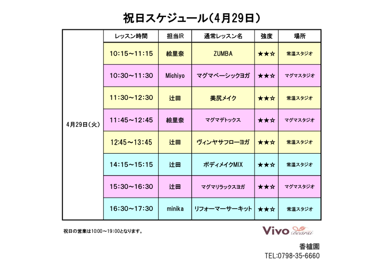 4/29(火)祝日のレッスンスケジュールはこちらです☆