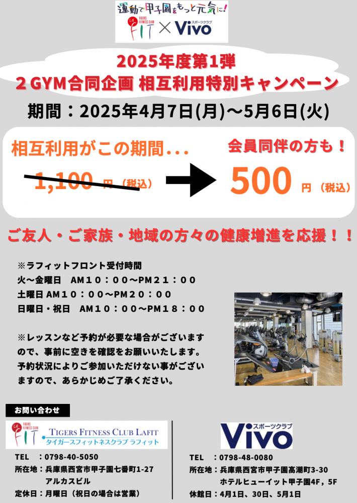 5月6日(火曜)まで、ヒューイット甲子園Vivoの会員様は