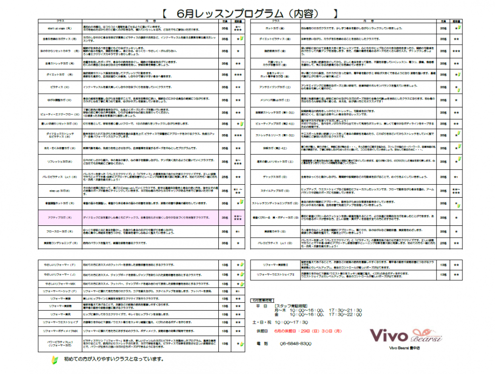 6月のレッスンスケジュールのご案内です。