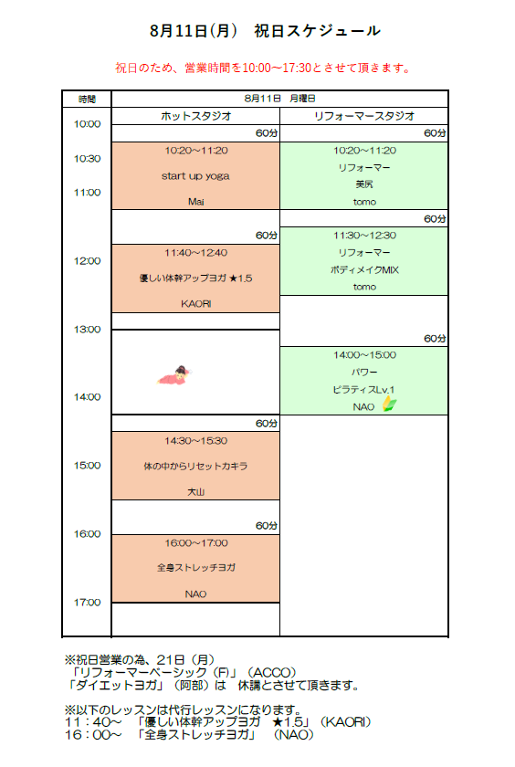 一部休講・代行レッスンあり。詳細は祝日プログラムをご確認ください。
