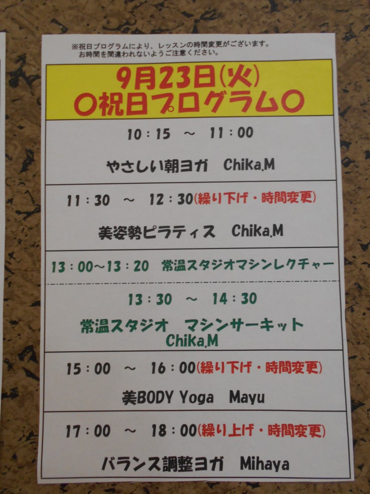 さて、本日は9月15日(月)と23日(火)の祝日プログラムのお知らせをいたします。