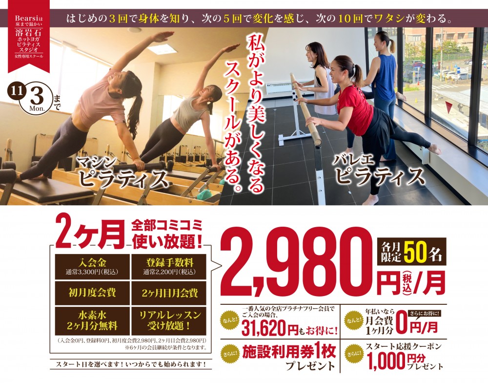 Bearsi香櫨園店では、2ヶ月間月額2,980円で通えるスタート応援キャンペーンを実施中。