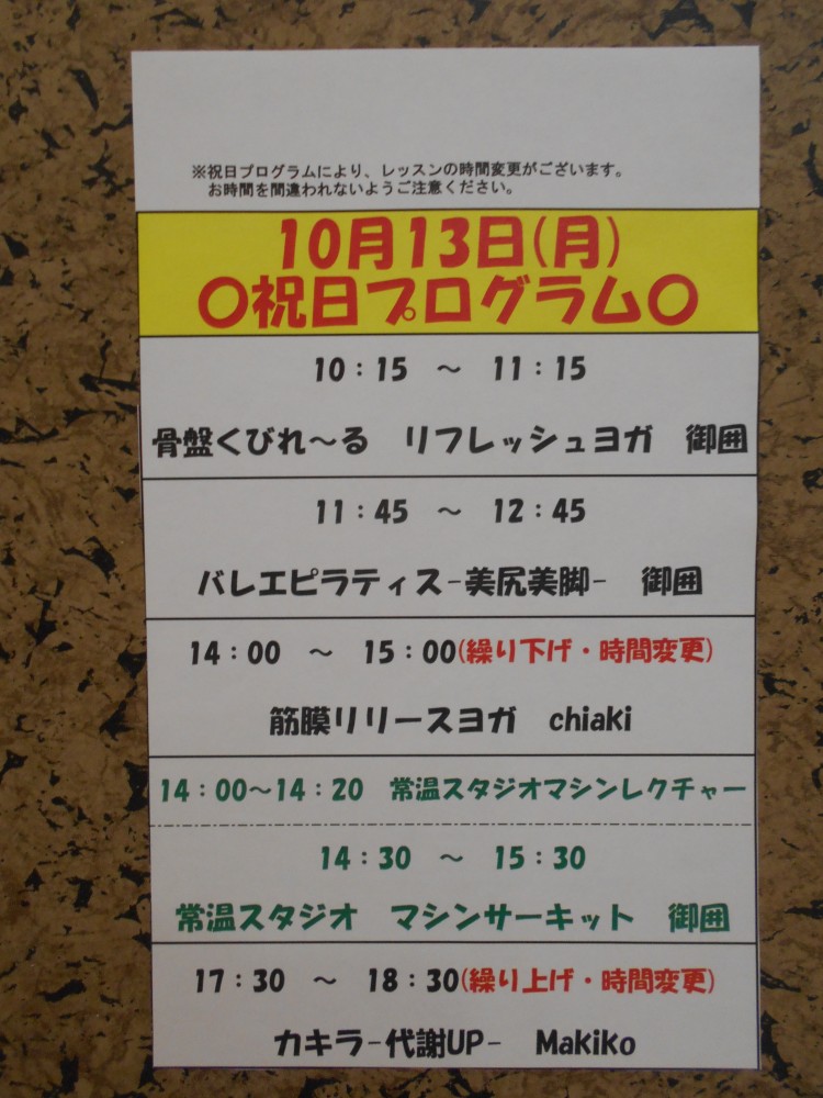 本日は10月13日(月)の祝日プログラムのお知らせをさせていただきます。