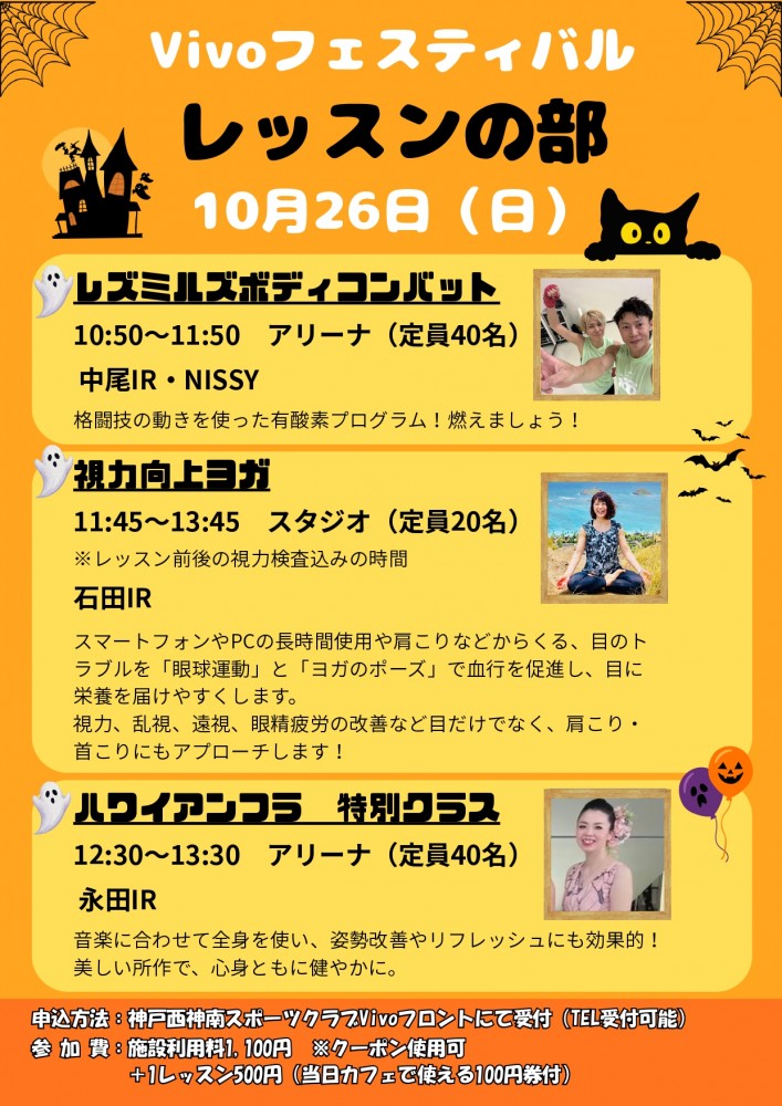 参加費:施設利用料(1,100円・施設利用券使用可)+1レッスン500円