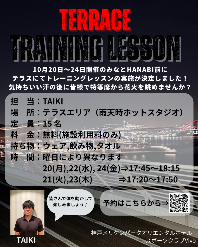 10月20日(月)~24日(金)の期間中、神戸メリケンパークで開催される「みなとHANABI 2025」に合わせて、vivoテラスで特別トレーニングレッスンを実施します。