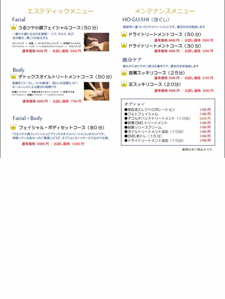 初回の方は、どのメニューもお試し価格で受けていただけます。
