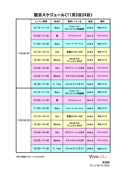 11月レッスンスケジュール、祝日スケジュール