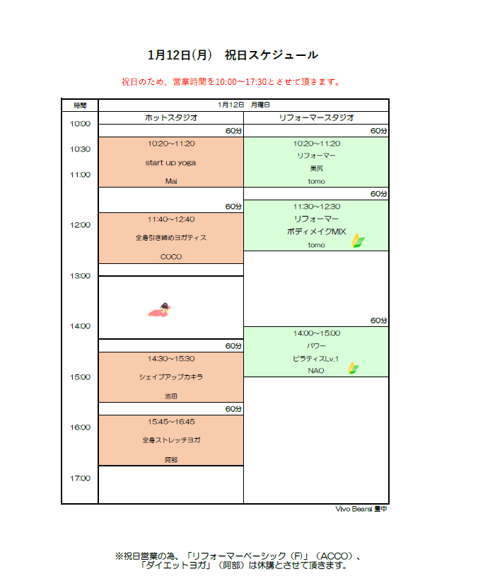 ※一部レッスンは通常と異なりますので、祝日プログラムをご確認ください。