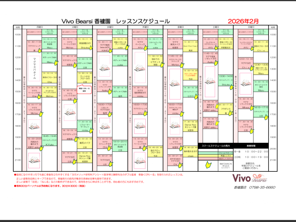 2月の詳しいレッスンスケジュールは、香櫨園店のスケジュール表をご確認ください。