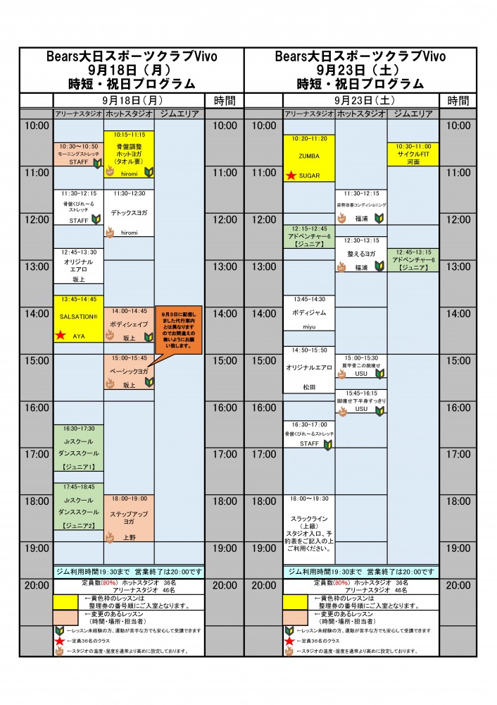 9月祝日レッスンスケジュール