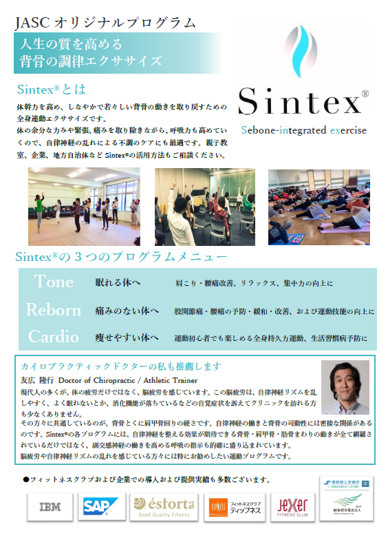 JASCオリジナルプログラム「人生の質を高める背骨調律エクササイズ」で体幹力を高め、しなやかで若々しい背骨の動きを取り戻すための全身連動エクササイズを『Sintex』といいます。体の余分な力みや緊張、痛みを取り除きながら、呼吸力も高めていき、自律神経の乱れによる不調のケアにも有効です。