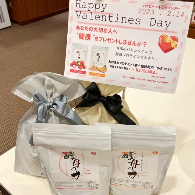 1月25日(水)よりフロントにて、酵母プロテインと施設利用券がセットになったバレンタインギフトセットを販売いたします。