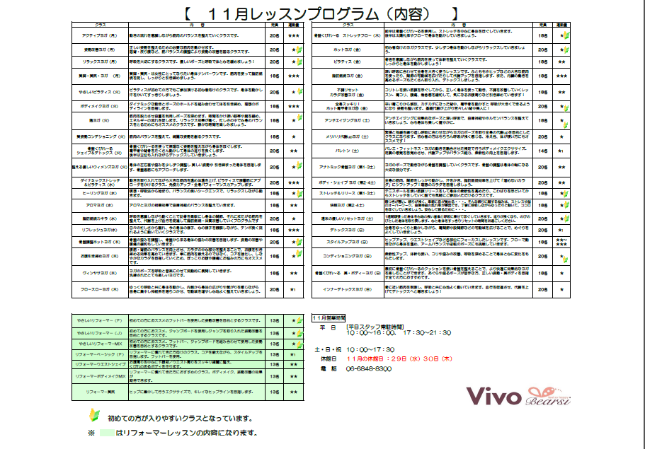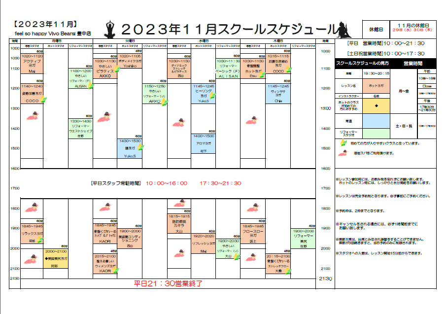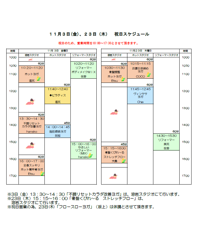 11月3日(金)、23日(木)は祝日短縮レッスンになります。
