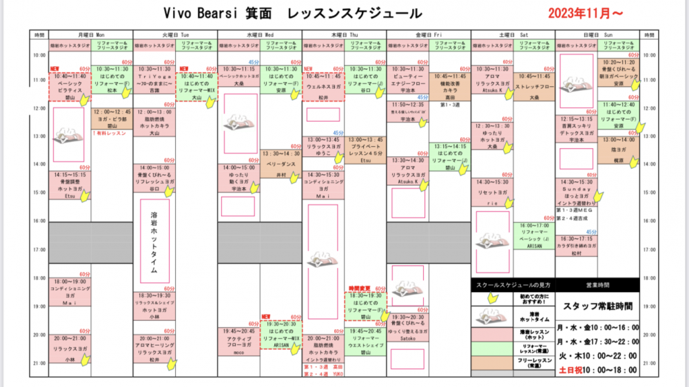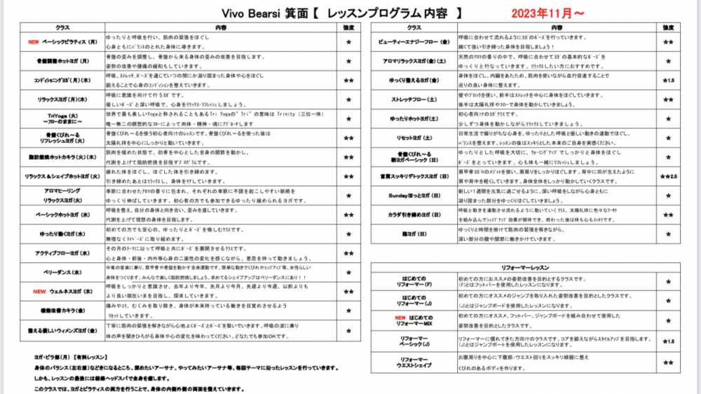 NEWレッスンや一部のレッスンで時間変更などもございますので、ご確認いただけるとうれしいです。