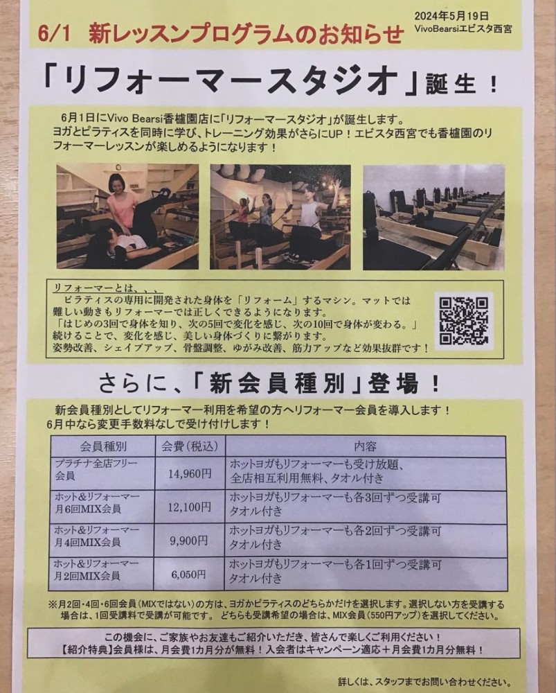 それに伴い、エビスタ西宮店の会員様でもリフォーマーレッスンが受けられるように、種別が新しくなります。