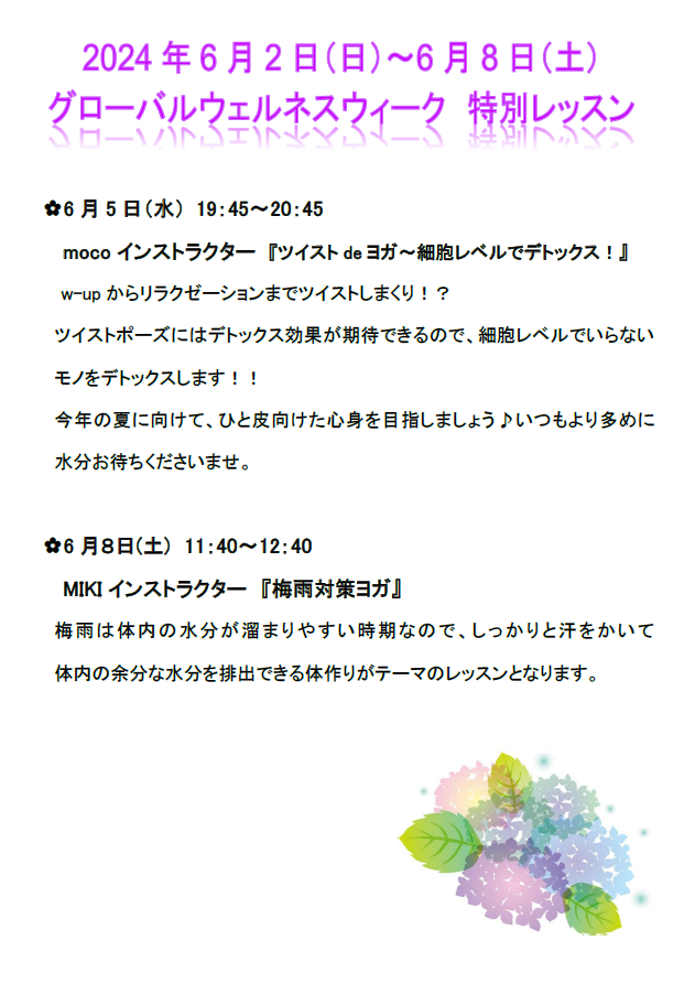 グローバルウェルネスウィーク 6/2~6/8 特別レッスンのご案内