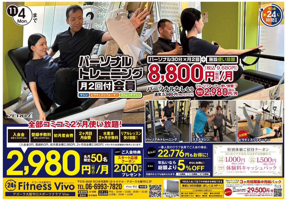 11月4日迄!月額2,980円(税込)で2か月間全ての施設をご利用いただけるキャンペーンを実施中です。この機会に、ジム、スタジオプログラム、サウナなど、充実した設備をお試しください。