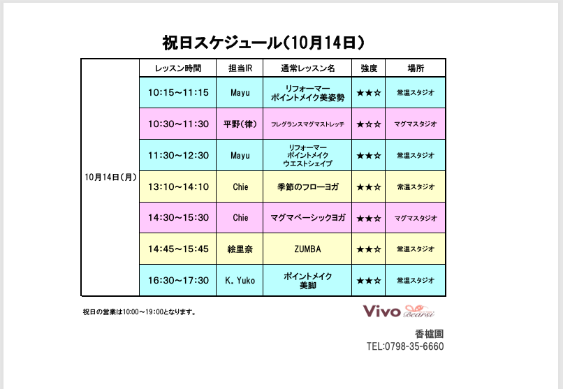 10月祝日レッスンスケジュール