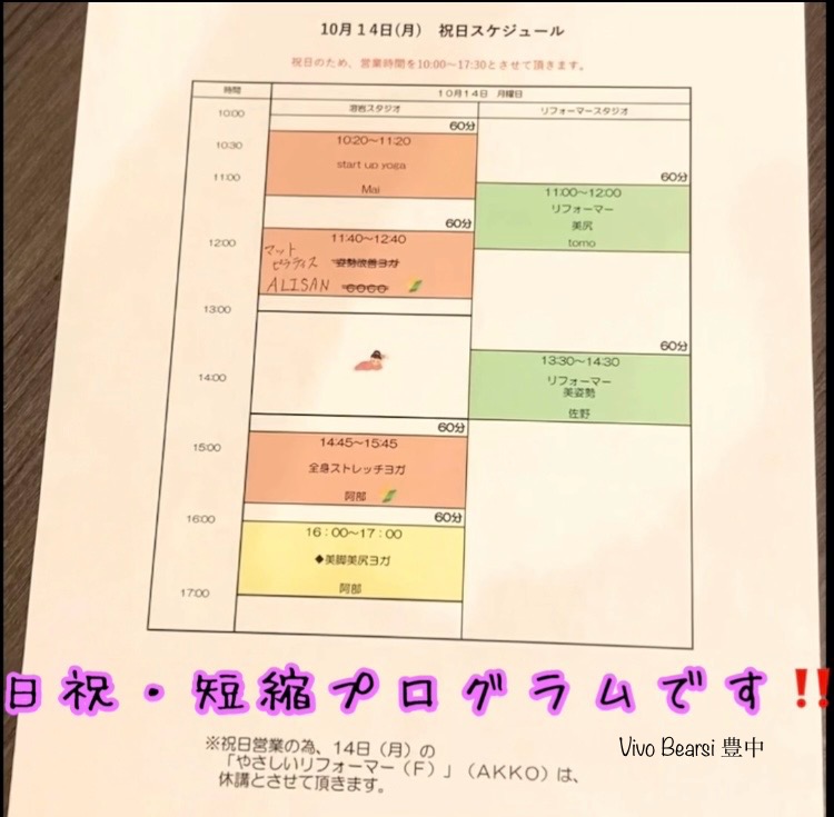明日10月14日(月)、祝日短縮プログラムになります。