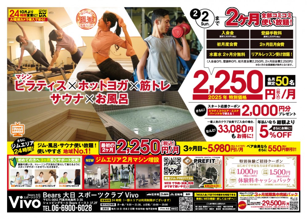2025年2月2日迄!月額2,250円(税込)/月で2か月間全ての施設をご利用いただけるキャンペーンを実施中です。この機会に、ジム、スタジオプログラム、サウナなど、充実した設備をお試しください。