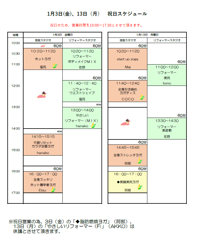 1月13日(月)の祝日レッスンは、短縮プログラムになっていますので、ご注意ください!!